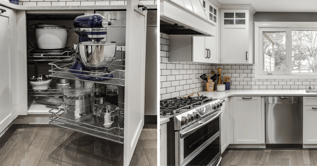 Voiding or blocking out a corner to some remodelers may be more controversial than the classic Lazy Susan, however this option should be considered for some spaces. Sometimes forfeiting access to the corner creates other benefits such as getting a larger drawer bank or not having a deep dark hole in your kitchen for things to get lost forever. Voiding out the corner can sometimes be the best option for the design and space, so don’t rule it out.